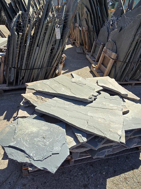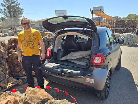I’m pretty sure it’s the first time a little Smart car has pulled up to the stone supply yard and loaded up a bunch of flagstones! Once we unloaded all the stones and stacked them around the edge, I stood inside the pond and started arranging the waterfall, checking how the water would flow with a garden hose. I was thrilled to see the pond with water finally flowing, but this was just the “first draft”.
