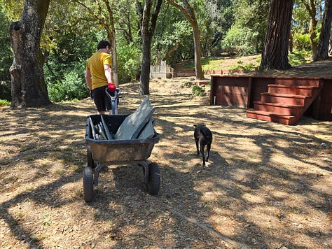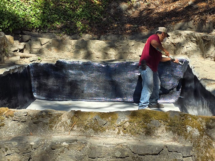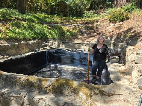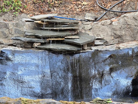 While I knew I could build the waterfall, I was a bit daunted by hauling out the muck and debris and then repairing the cement, so I started looking for someone to hire to get the pond excavated and waterproofed. One pond specialist quoted me $40-$50,000! A landscaper-builder took one look and told me “You don’t want a pond, it’s a big hassle.” Needless to say, I didn’t hire either of them!