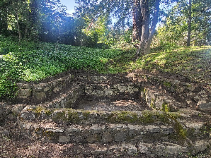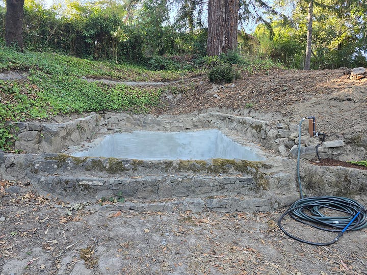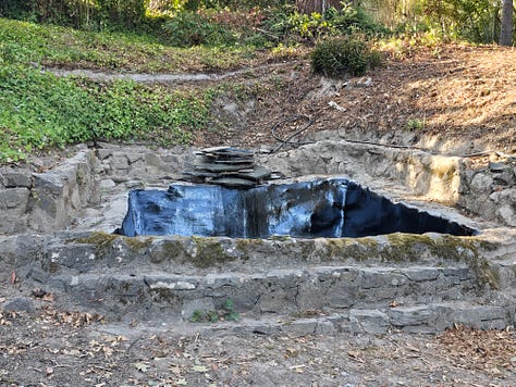 The first time my husband Nowell and I walked on this property in April 2023, we started planning a spot to build my art studio. I turned around to see what the view from the north-facing windows would be, and spotted the outline of this old rectangular pond under the ivy and spring clover: